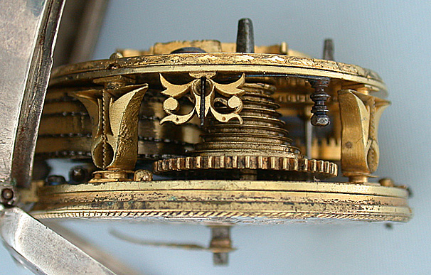 The inner case with fancy bow, typical pendant repair, and missing shutter to the winding hole. The outer case with old repair.