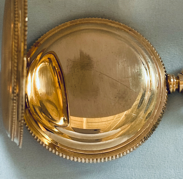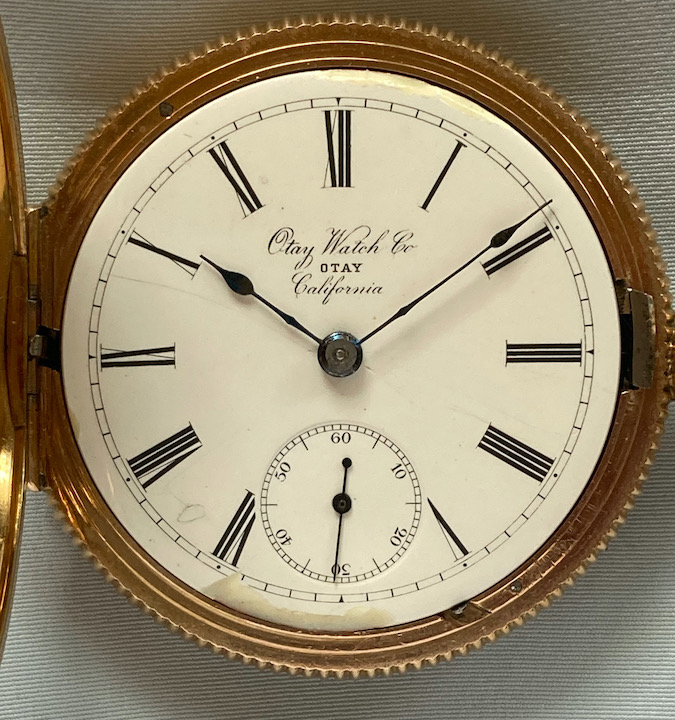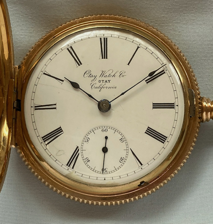 Rare Otay gold filled antique pocket watch circa 1892. White enamel dial (hairlines and repairs) with blued steel hands. Nickel 11 jewel movement (spots) with precision regulator