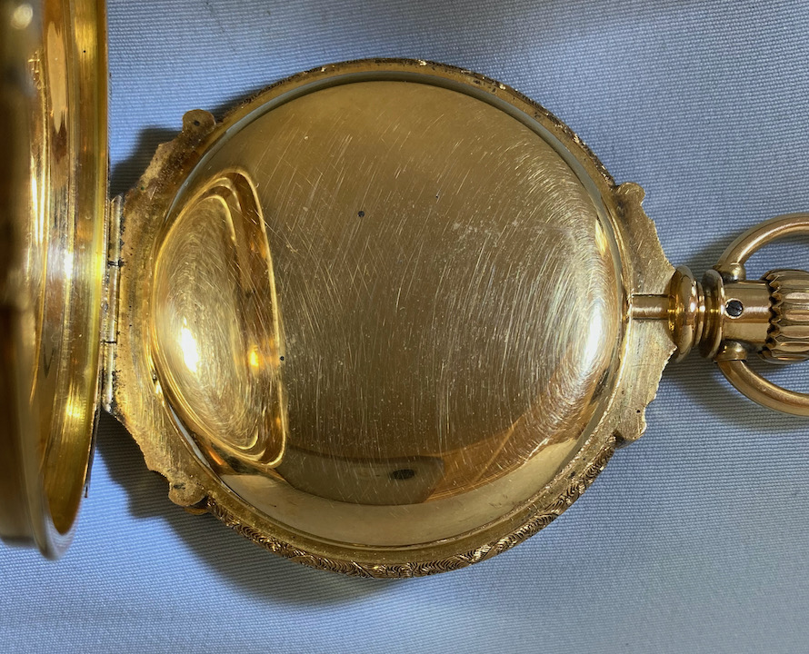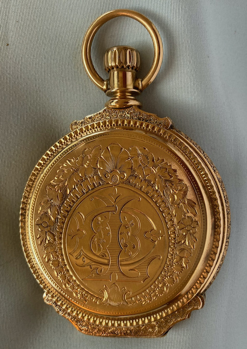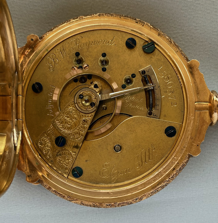 Fine very heavy Elgin box hinge antique pocket watch circa 1883. Beautifully engraved case. White enamel dial with blued steel hands. Gilt 15 jewel movement. Case net weight is approximately 57 dwt.