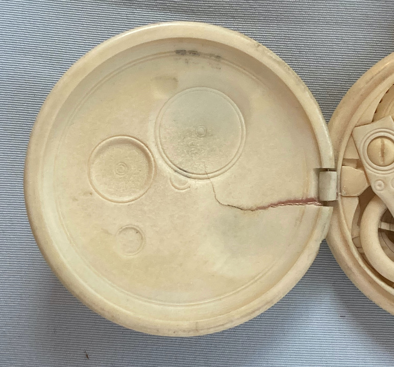 Fine and extremely rare Russian bone pocket watch and chain almost certainly by Bronnikov circa 1865. The watch and chain carved almost entirely from bone. Cracked back cover. The bone has shrunk over the decades and the watch does not run.