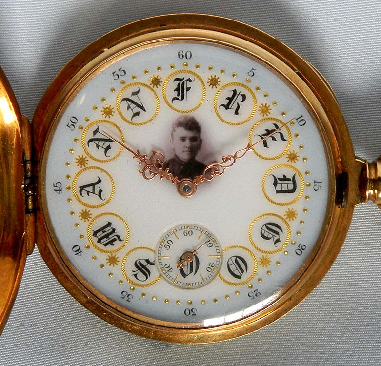 Albert Potter fine and rare 18K gold antique pocket watch circa 1880. Nickel movement of his unique design with diamond barrel cap jewel, gold and platinum timing screws, adjustable pallet fork, and precision regulator. Barrel ding and small spots. Heavy plain polish case with Knights of Pithias arms on the cover. Custom signed O'Hara dial.
