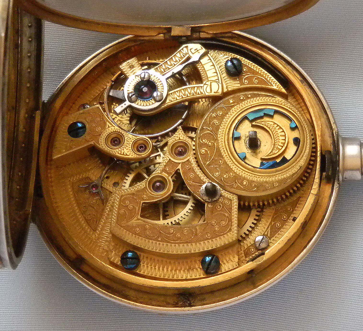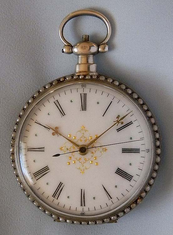 Fine and beautiful Swiss silver, enamel and pearl antique watch for the Chinese market circa 1850. 1850 The back with a lovely portrait of a young woman against a cobalt blue background. Fine scratches and edge repair. Lift springs not working. Fancy white enamel dial with gold foil decorations. Beautifully decorated 15 jewel lever movement.