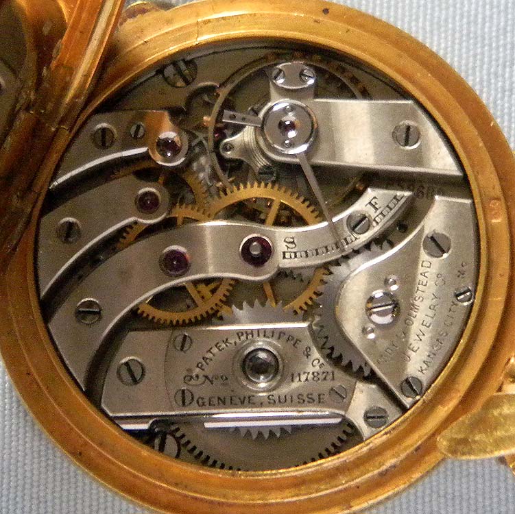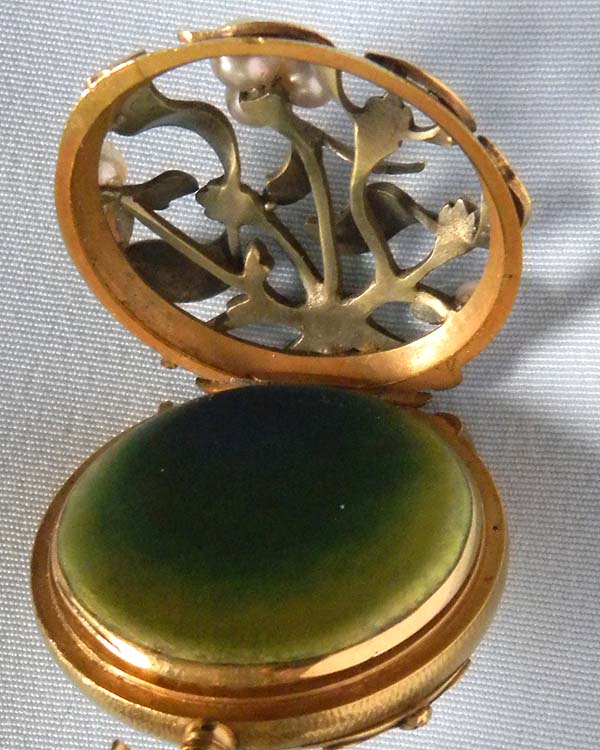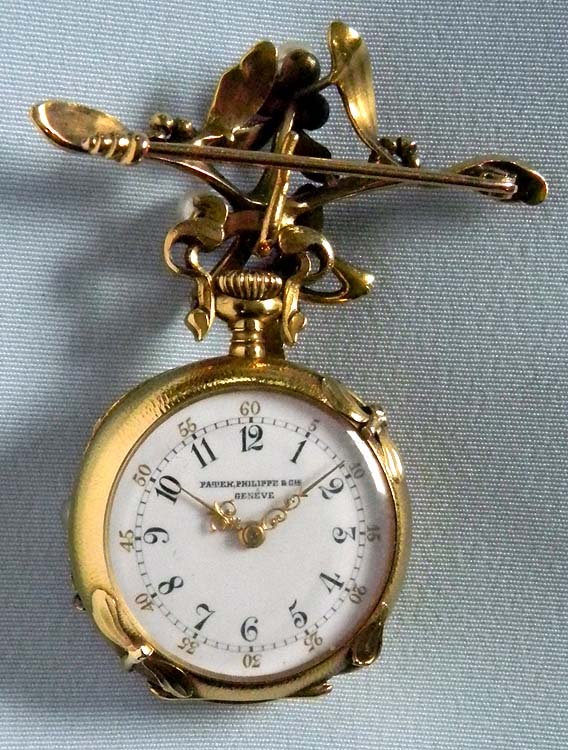 Beautiful and possibly unique Patek Philippe 18K gold, enamel and pearl ladies pendant watch with matching pin, circa 1902. Openwork high relief back with floral designs over a green enamel dust cover. Fine white enamel dial with gold and black markings and fancy gold hands. Nickel 18 jewel lever movement. In particularly fine condition throughout.