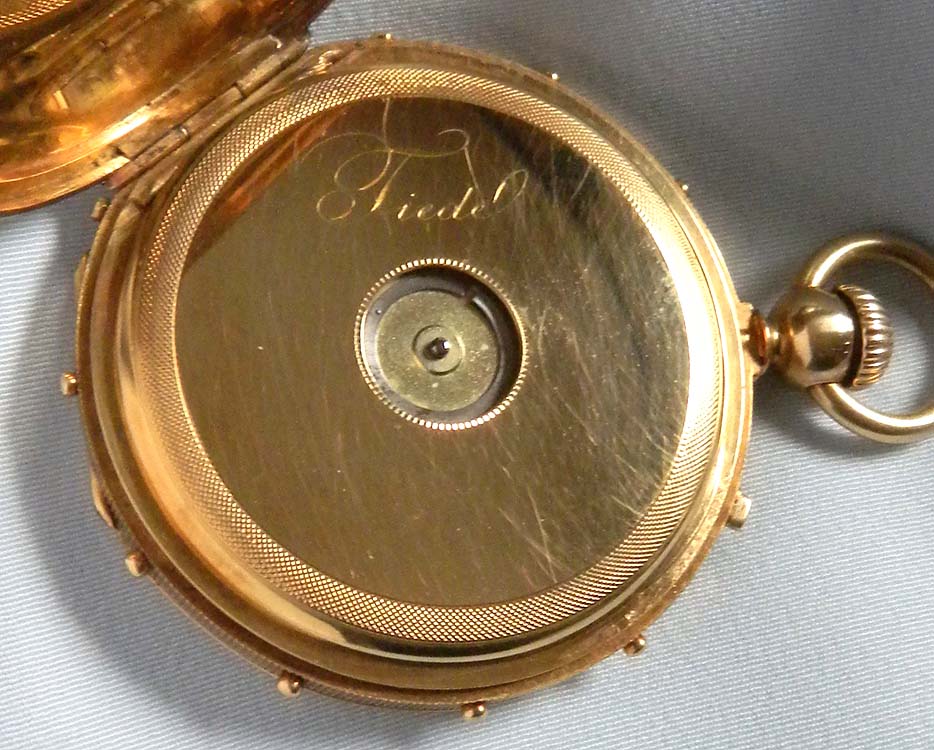 We know of only three of these watches including this example. One is in the Patek Philippe museum. Nikolaj Nikolaevich zu Sayn-Wittgenstein (1862-1934) was a descendant of the German Sayn-Wittgenstein dynasty and a member of the Imperial Russian Court. The inside of the cover of this watch is engraved 'Count N.N. Wittgenstein' in Cyrillic. In the former Soviet Union it was illegal to use titles, and there are signs of attempts to remove it. Christian Tiede was a very well known German retailer and watchmaker and he supplied German aristocratic families and public institutions with watches and clocks.