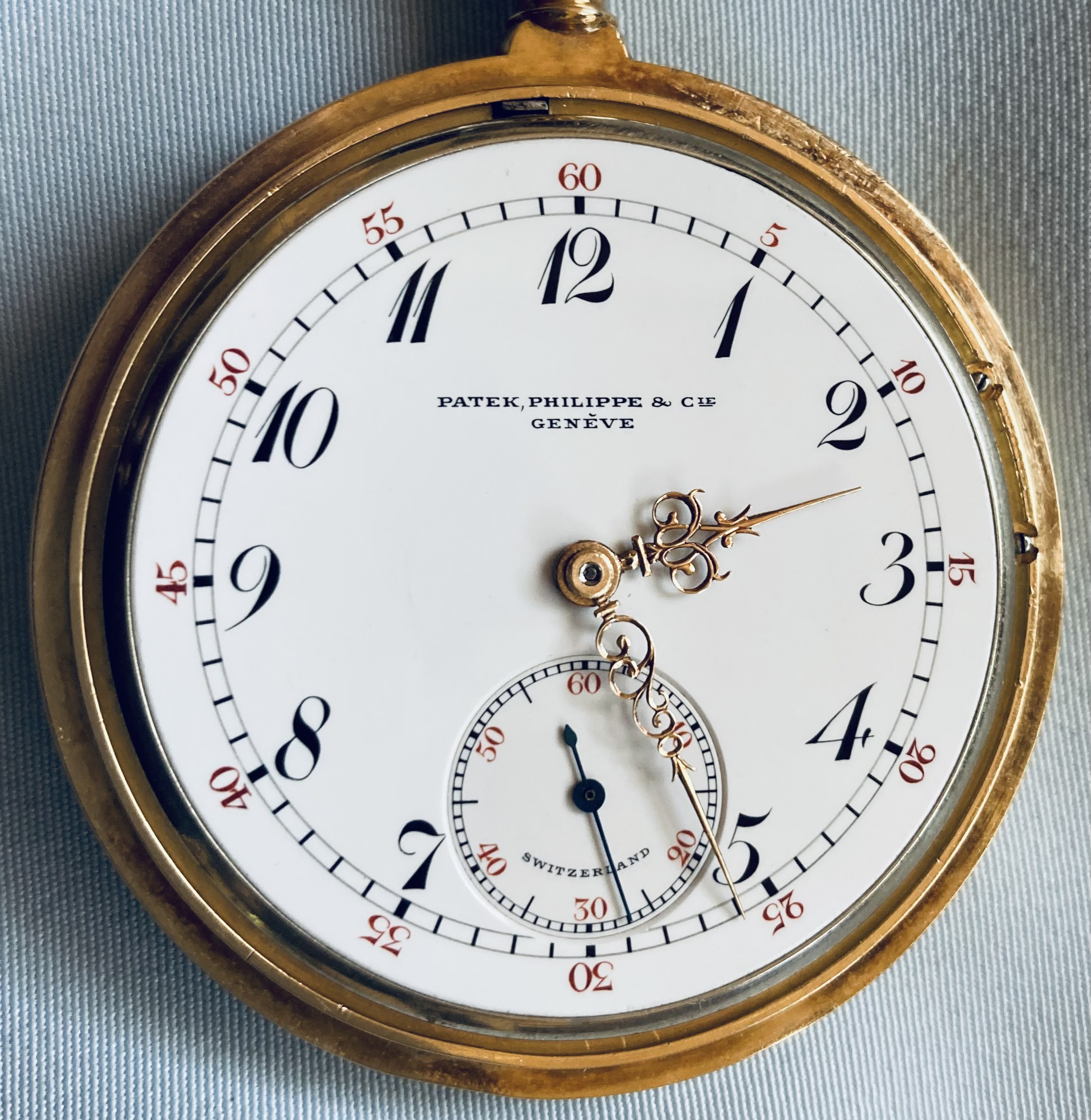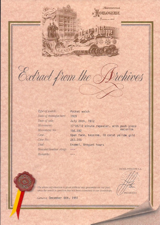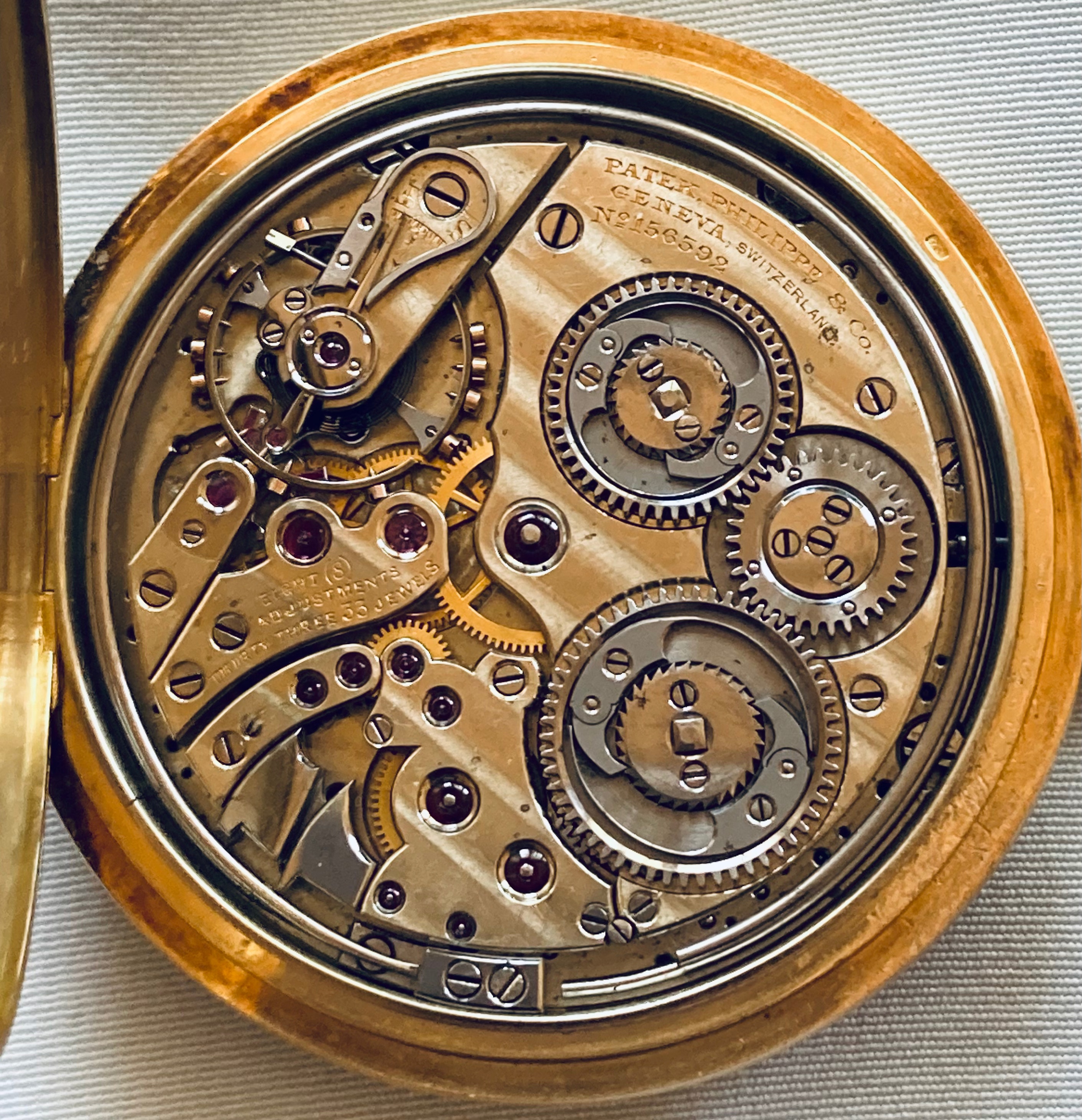 "When activated, this watch chimes the exact time using different chime tones to designate the hours, quarter hours, and minutes with loud clear tones. Traditional repeaters have a short repeater mainspring that is wound when the mechanism is cocked. On this watch the repeater mainspring is long and is wound along with the time mainspring. To sound this repeater, a small button in the crown is depressed which trips the repeater train and allows it to chime the time. Patek Philippe started making double-train trip repeaters around 1900 and continued making them, in very limited quantities, over the next 25 years. According to published estimates there are fewer than thirty of them known. " quarter hours, and minutes with loud clear tones. Traditional repeaters have a short repeater mainspring that is wound when the mechanism is cocked. On this watch the repeater mainspring is long and is wound along with the time cocked. On this watch the repeater mainspring is long and is wound along with the time mainspring. To sound this repeater, a small button in the crown is depressed which trips the repeater train and allows it to chime the time. Patek Philippe started making double-train trip repeaters around 1900 and continued making them, in very limited quantities, over the next 25 years. According to published estimates there are fewer than thirty of them known.