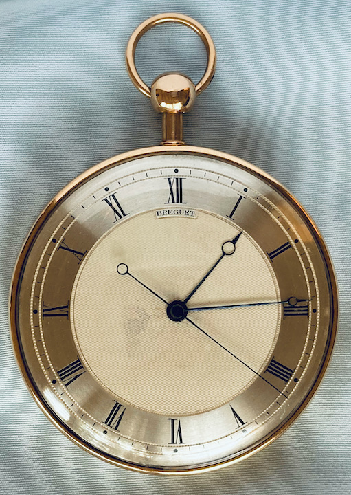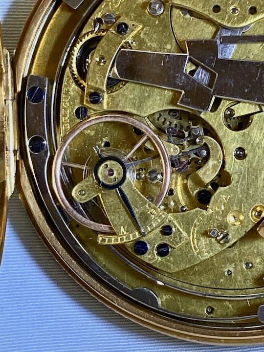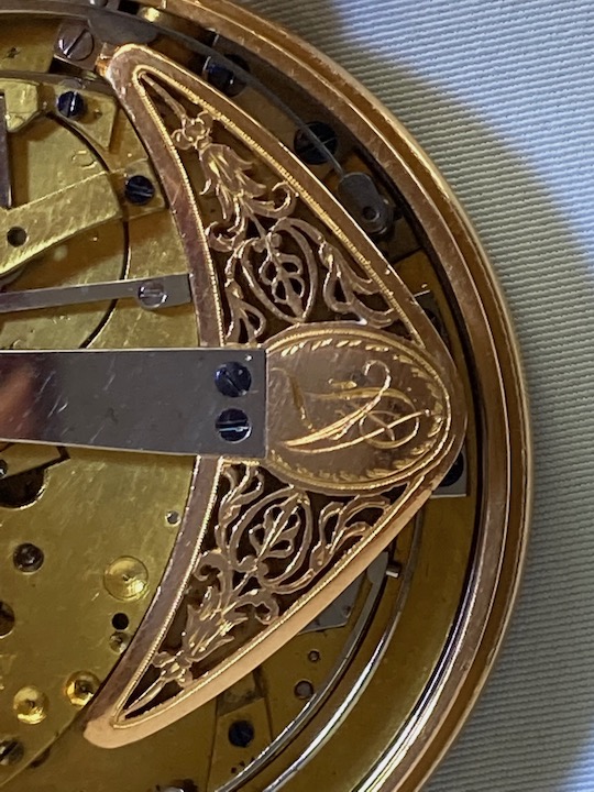 This watch is included in The Self-Winding Watch : 18th - 21st Century by Jean-Claude Sabrier and and the following is from this book. The movement is based on an ébauche similar to those made by Jaquet Droz. The watch was originally signed "a" Paris" with Breguet's name engraved later. The straight line lever escapement is the same type invented and used by Breguet. This watch may well have been finished in Breguet's workshop on special commission. The dial is identical to those used by Breguet, and the case was made by Mermillod who made cases for Breguet. The movement is extremely well finished, including the escapement, the pierced/engraved gold weight with initials, and the square gongs.