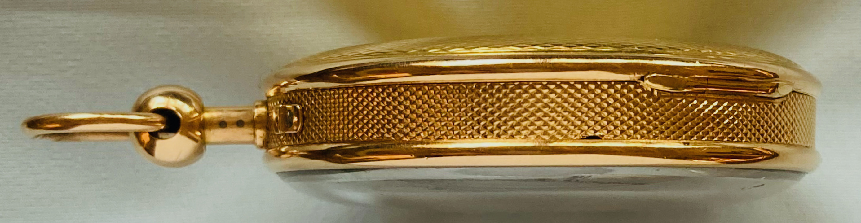 Very fine and exceptionally rare self-winding "Perpetual ' quarter repeater antique pocket watch probably made or finished by Breguet, circa 1810. Silver engine turned dial (minor stain) with blued steel Breguet hands. Heavy 18K gold engine turned drum case with repeat piston in the pendant. Straight line lever escapement. Gold oscillating weight weight to wind the watch, which is limited by polished steel banking pins and locks into place when the watch is fully wound. A handsome watch in very fine condition throughout.