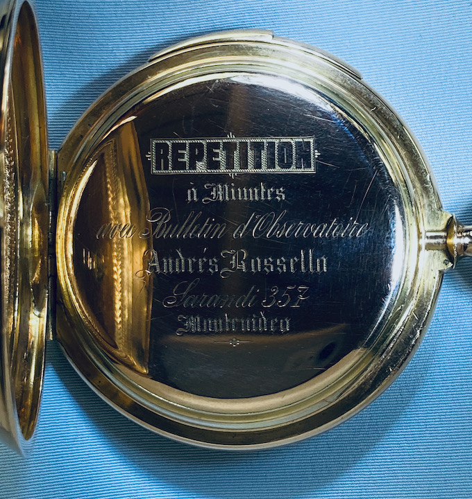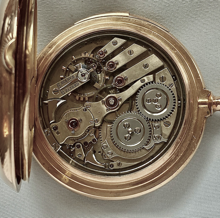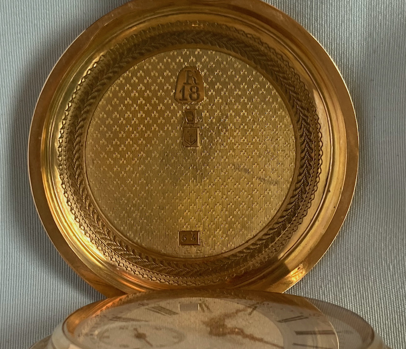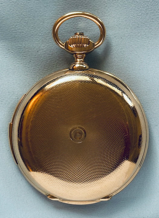Fine Swiss LeCoultre 18K gold minute repeater antique pocket watch circa 1890. Engine turned case (light edge wear) with repeat slide in the band. Fine white enamel dial with black markings and fancy gold hands. Fine nickel 32 jewel movement with wolf tooth winding. Sold by Rossello.