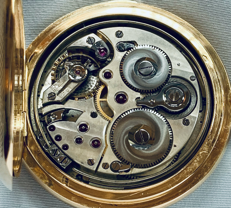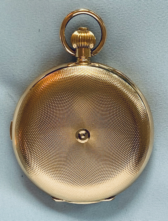 This watch automatically strikes the hours and quarters at every quarter, sounding three notes for each quarter. When the button is depressed it chimes the hours and quarters to the last quarter with a lovely soft tone.