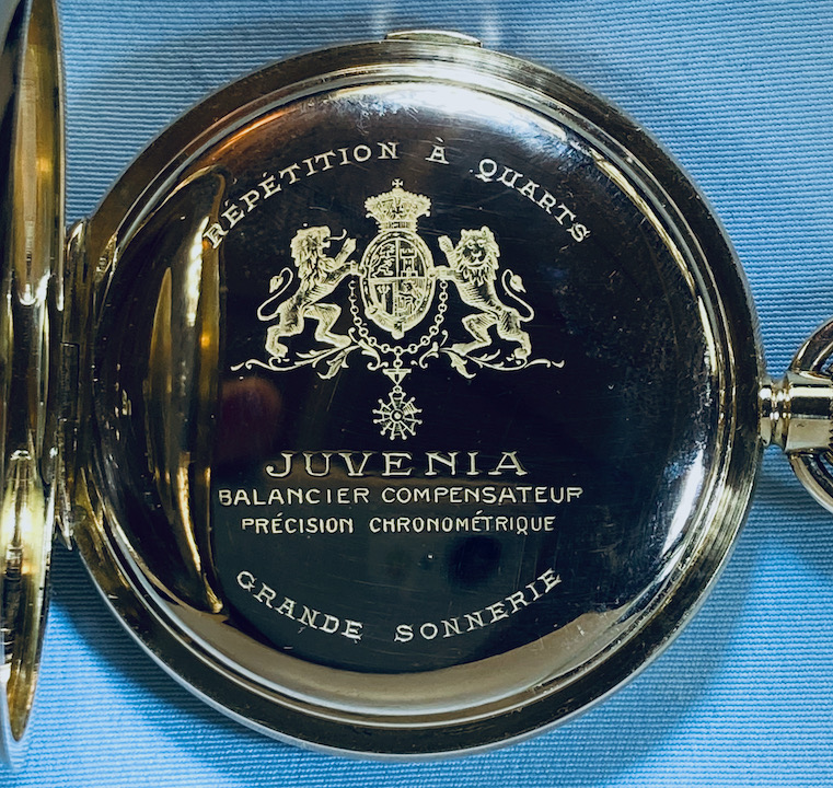 Fine and scarce Juvenia 18K gold triple gong quarter repeating grande sonnerie clockwatch clockwatch circa 1900. Fine engine turned case with trip button in the band to activate the repeater. Fine white enamel dial with blued steel hands. Lever at the edge to select strike or silence. Tandem wind estimated 29 jewel nickel movement. Particularly fine condition throughout.