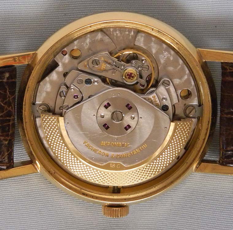 Fine 18K gold Vacheron and Constantin calendar automatic vintage wrist watch circa 1968. Original silver dial (small spots) with applied gold markers and gold hands. The case with downward sloping lugs. Rhodium 29 jewel 8 adjustment movement with partial 18K gold rotor.